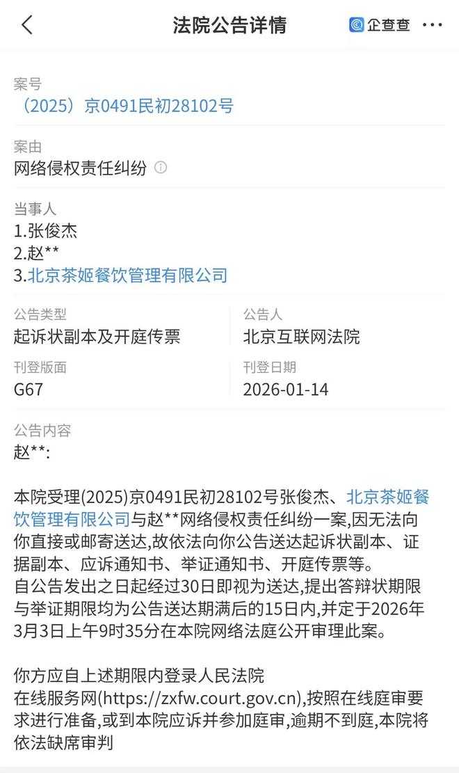 1月15日消息,据企查查显示,北京互联网法院受理了霸王茶姬创始人张俊杰、北京茶姬餐饮管理有限公司与赵某的网络侵权责任纠纷一案。