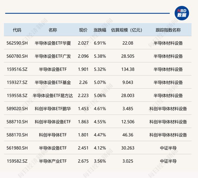 ETF涨跌幅方面,多只半导体设备相关ETF涨超5%。
