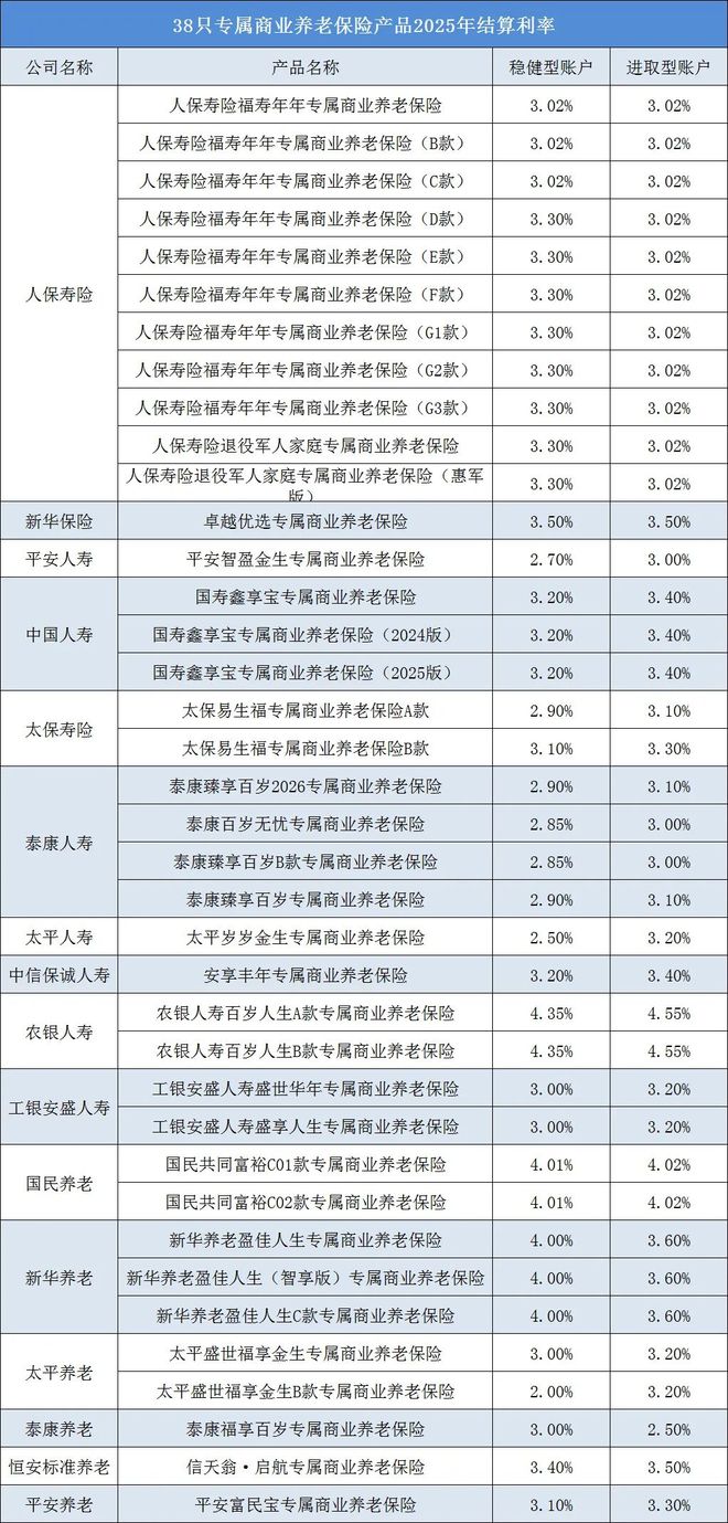 记者梳理各家保险公司官网的产品信息发现,目前已披露2025年结算利率的38只专属商业养老保险产品中,稳健型账户的结算利率分布在2%—4.35%区间,进取型账户的结算利率则分布在2.5%—4.55%区间。是指保险公司根据投保人缴纳的保费,在扣除初始费用后,将资金投入投资账户实际获得的年化收益率。