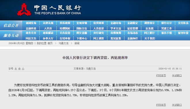 1、自2026年1月19日起,下调再贷款、再贴现利率0.25个百分点。下调后,3个月、6个月和1年期支农支小再贷款利率分别为0.95%、1.15%和1.25%,再贴现利率为1.5%,抵押补充贷款利率为1.75%,专项结构性货币政策工具利率为1.25%。