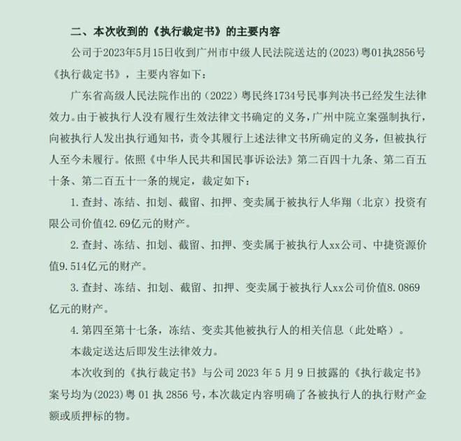 △广州中院执行裁定书。来源中捷资源公告。