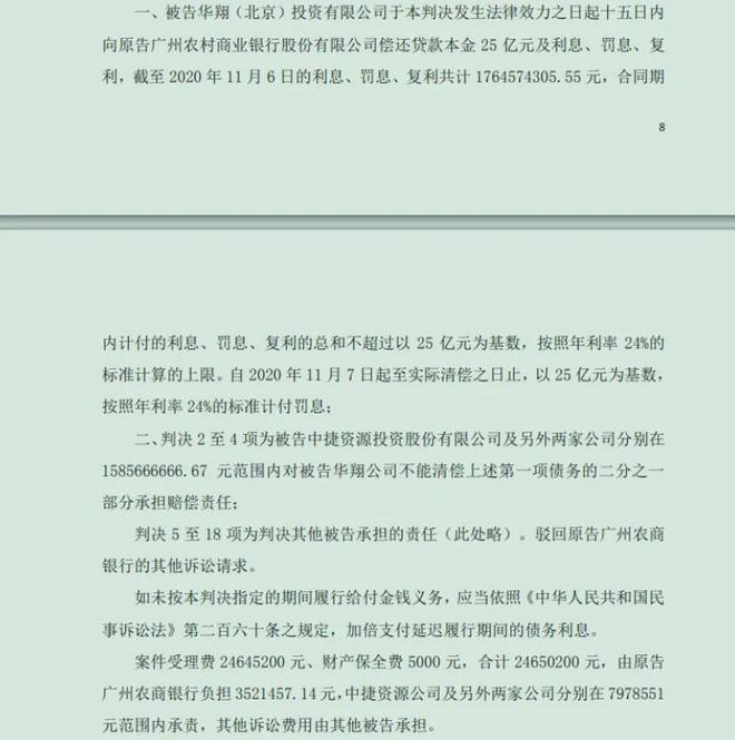 据中捷资源2022年披露的公告,广州市中级人民法院作出(2020)粤01民初2011号一审判决,判令华翔投资偿还25亿元本金及利息、罚息、复利共计17.65亿元,中捷资源等三家公司在15.86亿元范围承担赔偿责任。