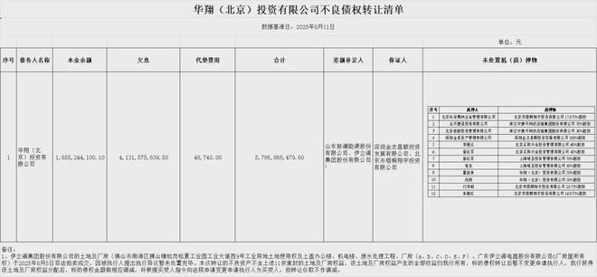 湘财Plus注意到,广州农商银行2025年12月拍卖华翔投资不良债权的公告披露最新的财务数据。据拍卖公告,截至2025年8月,广州农商银行对华翔投资债权金额共计57.87亿元,其中本金余额16.55亿元、利息41.32亿元、司法清收代垫费用48740元,差额补足人为新潮能源、伊立浦(原德奥通航,已退市),保证人为深圳金志昌顺投资发展有限公司、北京市梧桐翔宇投资有限公司,质押物为12笔非上市公司股权。