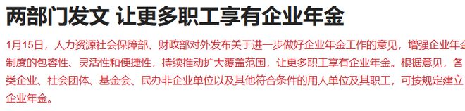 人力资源社会保障部、财政部对外发布关于进一步做好企业年金工作的意见,增强企业年金制度的包容性、灵活性和便捷性,持续推动扩大覆盖范围,让更多职工享有企业年金。根据意见,各类企业、社会团体、基金会、民办非企业单位以及其他符合条件的用人单位及其职工,可按规定建立企业年金。