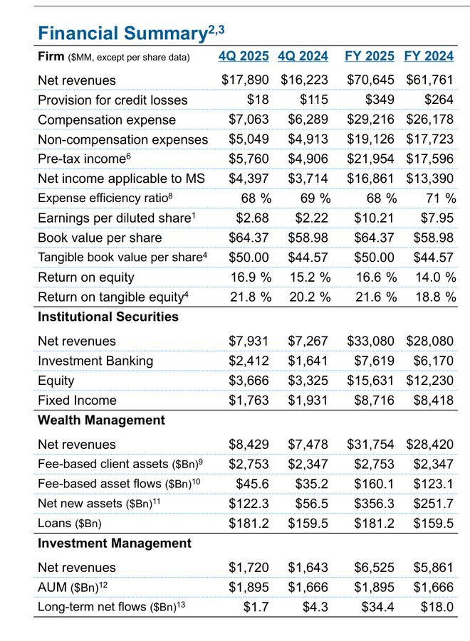 1月15日,摩根士丹利公布了2025年第四季度及全年业绩: