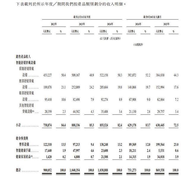 SKG未来健康新品扩张则更明显体现在健身恢复与塑形设备上,其招股书数据显示,该品类收入占比由13.5%波动至23.0%。