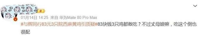 值得一提的是,网络平台上,也有不少大 V表达了对该起事件的看法,他们大多持鲜明的否定态度,有认为“与辉同行全程装哑巴,选品翻车,真的败好感”,有认为“如果不加管制,这种做法可以摧毁任何一个地方的特色产业”,还有的发出“83块钱3只鸡都敢吃?……”的调侃。