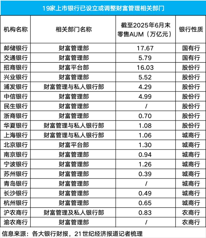 已有19家上市银行设立或调整了财富管理相关业务部门,涵盖2家国有大行、7家股份制银行、8家城商行及2家农商行。