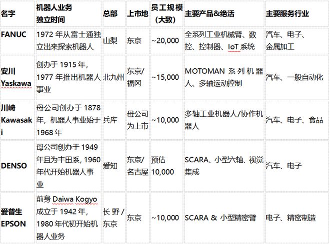 Fanuc的背景是富士通,数控专家出身,安川是电机、电气控制,川崎是重工业,Denso是汽车零部件起家、且与丰田长期合作。