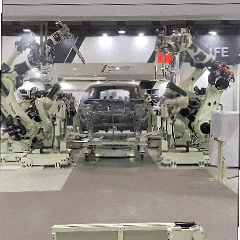 再来说另一位大牌:川崎重工。它也拿汽车当“道具”,秀出了一辆整车是如何被很多只机械臂扑上来加工的。