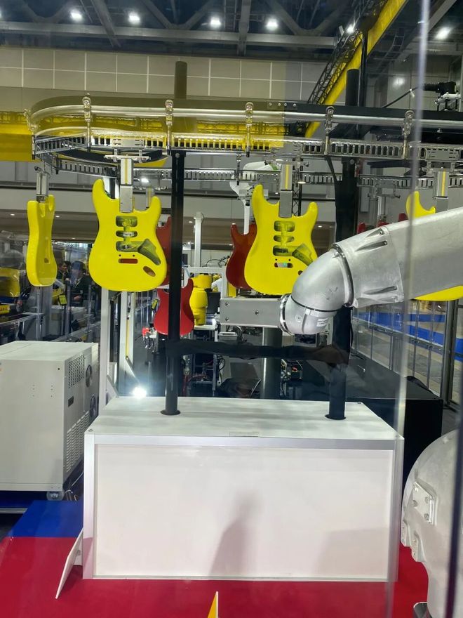 FANUC坐全球第一把交椅,在世界工业机器人出货量长期位列第一梯队,且存量装机量常年第一。此次活动它的整活是用机械臂为吉他进行涂装(下图),这属于传统艺能,FANUC最早就是汽车涂装机器人起家。