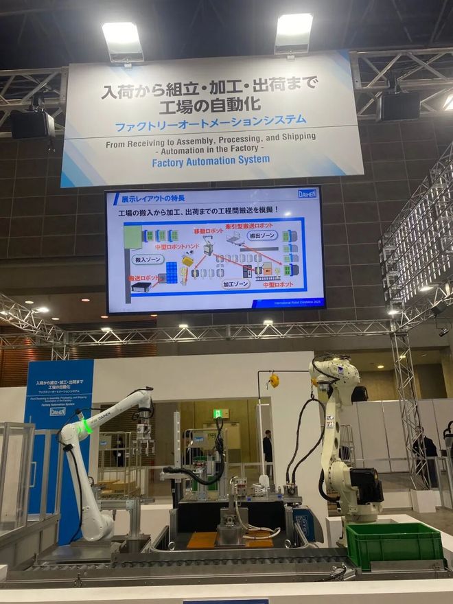 起码日本本地会尽可能贯彻无人化。下图为变压器制造起家的Daihen在展会上所宣传的“从收到零部件到加工到出货并运出而实现的整体自动化”,全员都是机器人,由机器人负责一切。不过这种宣传区域有些门可罗雀,略显平淡,炒不出太大新闻。