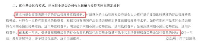 更加值得关注的是,政策还提到“施行与业绩浮动管理费率机制”,“在未来一年内,引导管理规模居前的行业头部机构发行此类基金数量不低于其主动管理权益类基金发行数量的60%”。