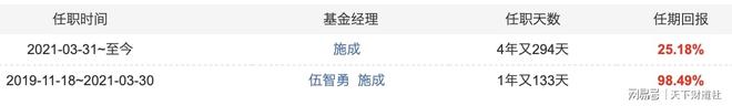 进一步细分可知,从2019年底成立至2021年3月底,这只基金的主要基金经理是伍智勇,这期间涨幅高达98%;而从那之后,这只基金变为施成单独管理,这几年基金净值出现大幅回调。