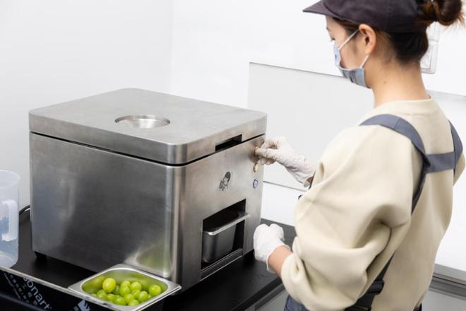 喜茶店员使用自动去皮机制备青提鲜果 图源:网络