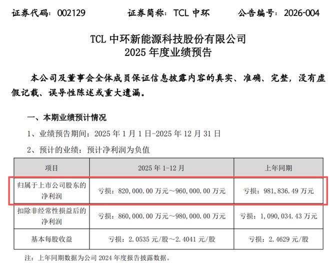 TCL中环,预亏82-96亿;