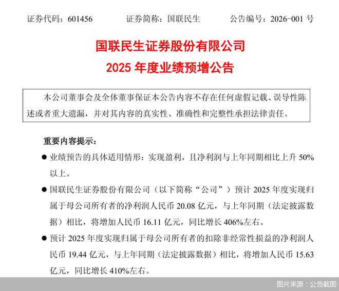 1月18日,国联民生证券发布业绩预增公告,预计2025年实现归母净利润20.08亿元,与上年同期相比增加16.11亿元,同比增长406%左右,国联民生证券在公告中表示,业绩大幅增长一方面源于报告期内完成对民生证券的收购并将其纳入合并报表范围,另一方面受证券投资、经纪及财富管理等业务的收入增长带动。