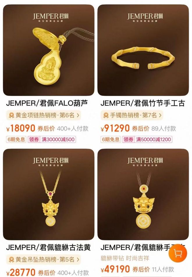 然而强中自有强中手,君佩8.8克的貔貅手链售价22530元,每克价格超过了2560元;因为火爆而不得不延长工期的琳朝珠宝,目前每件黄金作品的结算单克价也超过了1930元。
