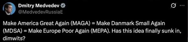 19日,梅德韦杰夫在社媒平台上嘲讽道:“让美国再次伟大(MAGA)=让丹麦再次变小(MDSA)=让欧洲再次贫穷(MEPA)。这个道理,蠢货们终于明白了吗?”