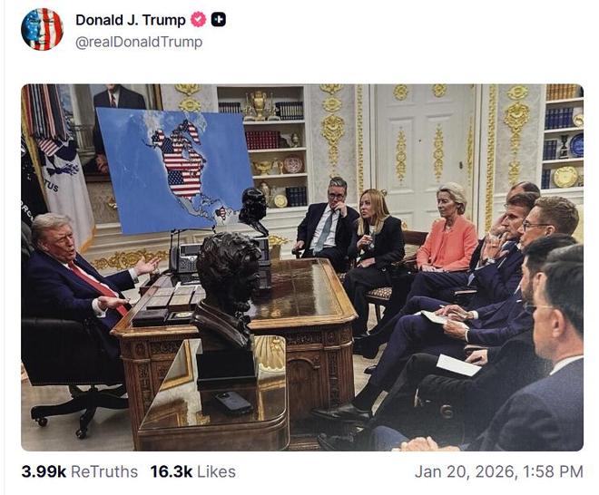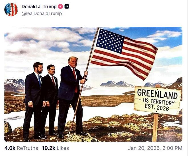 其中一张描绘他在椭圆形办公室与欧洲领导人交谈,背景是西半球地图,美国国旗覆盖在美国、加拿大、委内瑞拉和格陵兰岛上。另一张AI生成图像显示特朗普在白雪皑皑的山地景观中升起美国国旗,角落里有"格陵兰岛美国领土成立于2026年"的标志。