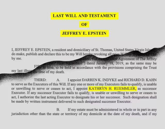 此外,爱泼斯坦在2019年1月18日的遗嘱中,还将Ruemmler列为遗嘱执行人之一。