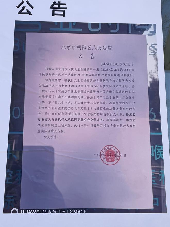 执行过程中,被执行人嫣然医院在法定期限内未按生效法律文书将北京市朝阳区望京东园519号楼交付给原告张毅,现责令被执行人嫣然医院公告之日(2025年11月4日)起三十日内履行生效法律文书确定的义务,将北京市朝阳区望京东园519号楼交付申请执行人张毅,房屋实际占有人与被执行人承担同等腾空和交付义务。逾期不履行,法院将依法强制腾空上述房屋。