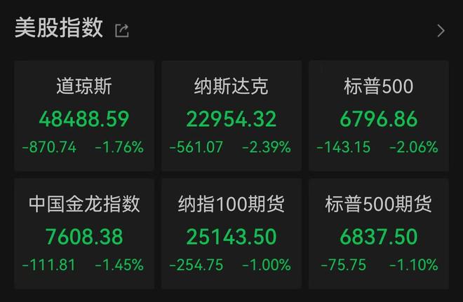 在特朗普威胁要对八个欧洲国家加征新关税后,市场剧烈震荡。美国三大股指全线收跌,道指跌1.76%,标普500指数跌2.06%,纳指跌2.39%。