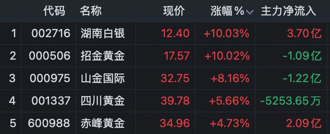 市场热点方面,贵金属概念股午后放量拉升,板块指数由早盘跌逾3%转为涨3.5%报收,创历史新高。湖南白银、招金黄金均在午后开盘没多久就快速涨停,山金国际、四川黄金等涨幅居前。