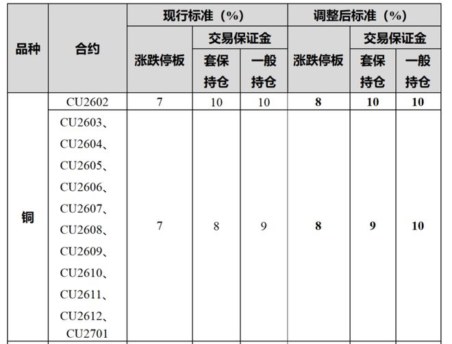 具体来看,铜期货已上市合约的涨跌停板幅度调整为8%,一般持仓交易保证金比例调整为10%。CU2602的套保持仓交易保证金比例调整为10%,其余合约的套保持仓交易保证金比例调整为9%。
