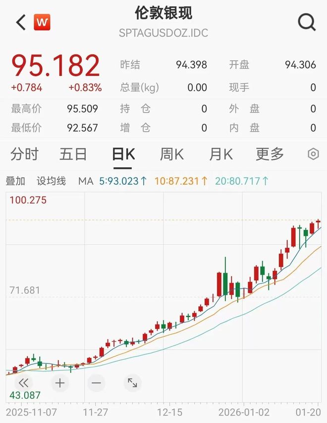 现货白银首次向上触及95美元/盎司,日内上涨0.83%,今年以来累计上涨33%。