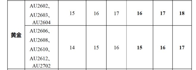 黄金期货AU2606、AU2608、AU2610、AU2612、AU2702合约涨跌停板幅度调整为15%,套保持仓交易保证金比例调整为16%,一般持仓交易保证金比例调整为17%。