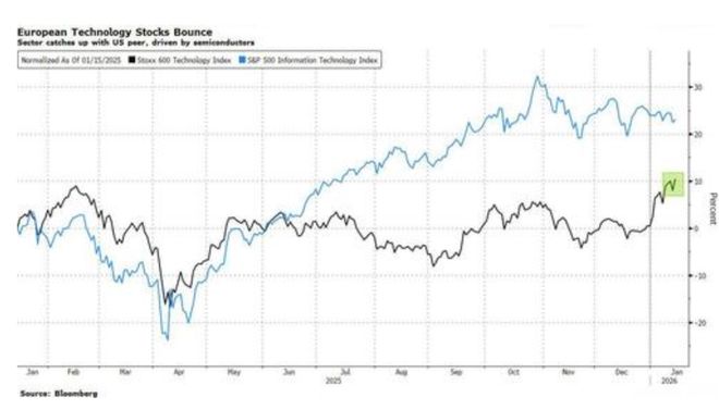 今年以来,欧洲科技股意外大幅跑赢美国同类板块。斯托克600科技指数单月上涨10%,成为该地区表现第二强的板块;而同期标普500信息技术指数则几乎持平。