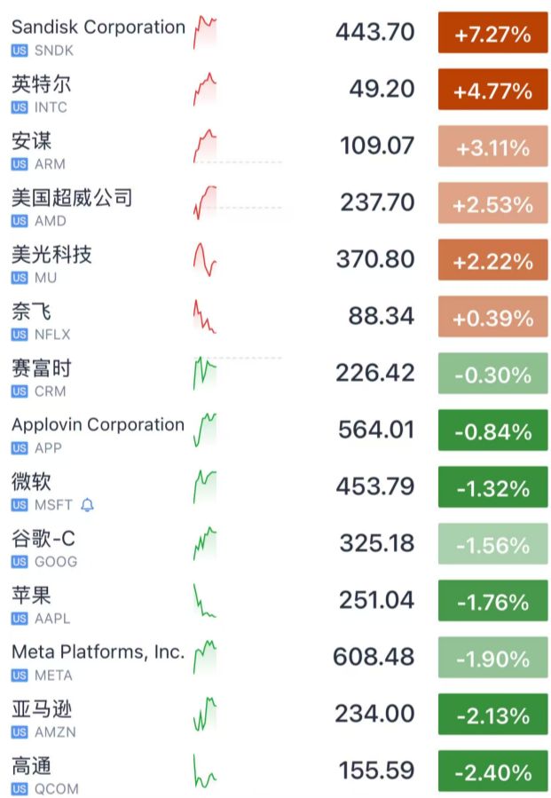 个股方面,存储芯片大涨,其他科技股普遍下跌。毕竟,存储芯片就像黄金一样坚挺!
