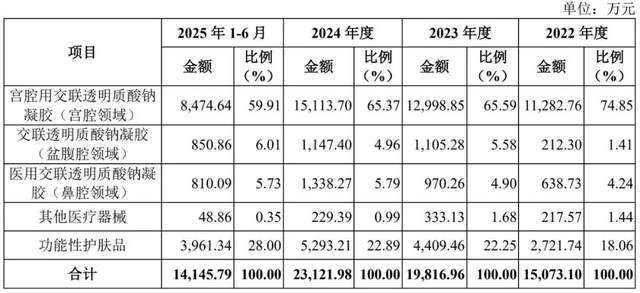 目前,宫腔用交联透明质酸钠凝胶产品是百瑞吉的第一大单品,2022年—2024年及2025年上半年(下称“各期”)分别实现收入1.13亿元、1.3亿元、1.51亿元和0.85亿元,分别占公司主营业务收入的74.85%、65.59%、65.37%和59.91%。尽管近年来占比逐年下降,但仍维持在60%左右。