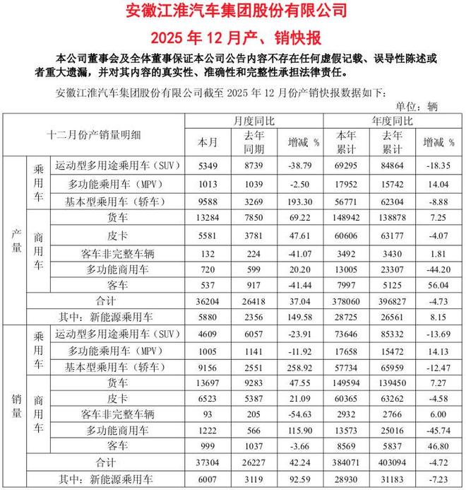 数据还显示,2025年全年江淮汽车商用车皮卡累计销量为6.04万辆,较同期的6.33万辆下滑4.58%;多功能商用车累计销量为1.36万辆,同比下滑45.74%;运动型多用途乘用车(SUV)销量为7.36万辆,同比下滑13.69%;基本型乘用车(轿车)销量为5.77万辆,同比下滑12.47%;多功能乘用车(MPV)销量为1.77万辆,同比增长14.13%。