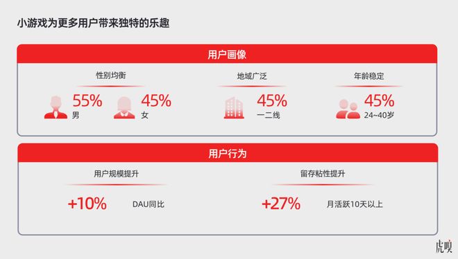 据虎嗅了解,微信平台上,社交玩法成熟的小游戏中,社交渠道带来的用户占比可达 30%-50%,棋牌类游戏这一比例更是高达 70%-80%;更关键的是,社交渠道用户的留存率比行业大盘高出 20%——这印证了微信通过好友、群聊等渠道实现社交裂变的低成本精准获客能力。