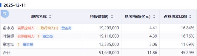 本次交易前,俞永方、叶建标、章忠灿合计持股比例45.29%,表决权比例45.29%;交易后,其合计持股比例33.97%,表决权比例变为0.00%。