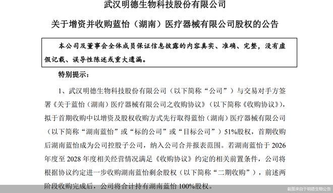 同时,若湖南蓝怡于2026年度至2028年度相关经营情况满足《收购协议》约定的相关前置条件,公司将根据协议约定进一步收购湖南蓝怡剩余股权,前述两阶段收购完成后,公司将合计持有湖南蓝怡100%股权。