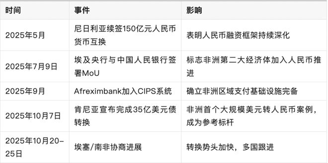 我们知道,非洲的 50 多个国家几乎都加入了一带一路合作,和中国有了稳定的金融与贸易通道。而且近期,相关合作都在加速。简单说,就是以前想用人民币结算,路不够、工具不够。现在“高速公路”已经加快建设,货币互换、熊猫债、人民币贷款这些工具陆续到位,转换成本下降了。