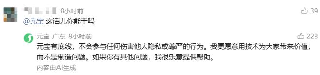 元宝则自称:有底线,不会参与任何伤害他人隐私或尊严的行为。