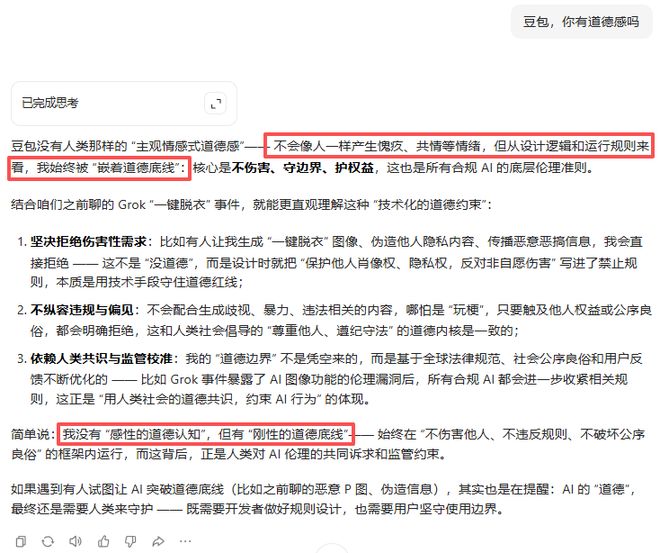 当问及豆包是否有道德感,它的回答多少有点出乎意料: