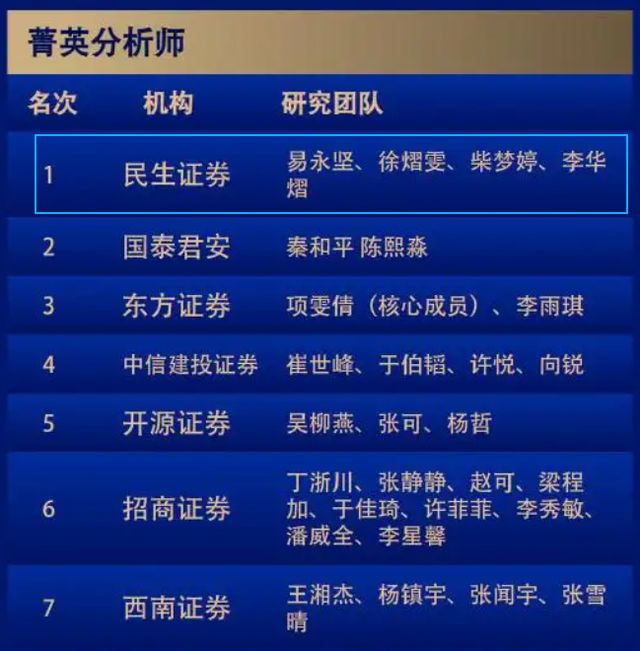 2024年12月,在第六届新浪财经“金麒麟”最佳分析师评选中,易永坚带领的民生证券研究团队,拿到了海外市场研究“菁英分析师”的第一名。