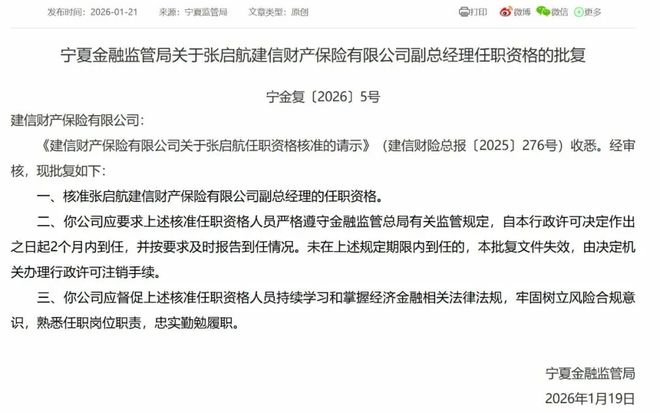 今日,宁夏金融监管局披露公告,核准张启航建信财产保险有限公司(下称“建信财险”)副总经理的任职资格。建信财险成立于2016年10月,为中国建设银行集团旗下险企,注册资本10亿元。