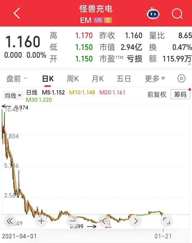 股价方面,截至1月21日美股收盘,怪兽充电报1.16美元/股,对比上市首日一度超过9美元的股价最高点,怪兽充电的市值已蒸发了约90%。