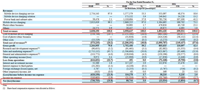 但代理商规模的扩大,却未能带来长期的业绩增长。2024年,怪兽充电移动设备充电订单同比下滑12.6%至5.74亿次,公司全年营收18.94亿元,同比下滑36%;并由盈转亏,净亏损1353万元。