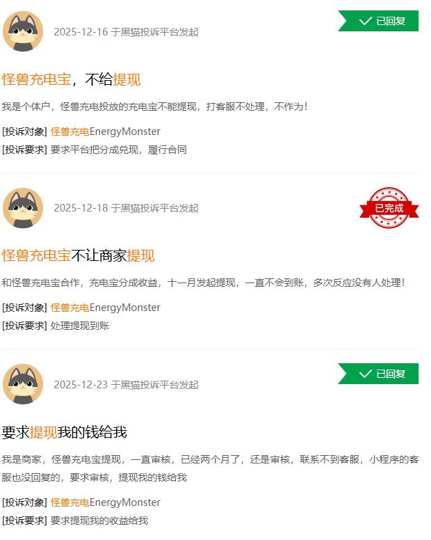 红星资本局梳理发现,怪兽充电合作商户无法提现的情况并不是个例。在黑猫投诉平台上,涉及“怪兽充电提现”的投诉超180条,投诉内容大体相似——商户在门店放置怪兽充电设备创收,前期可通过平台正常提现,后期发起提现申请则显示一直处于审核中、提现申请未通过等,代理商联系不上、联系怪兽充电客服也没有结果。