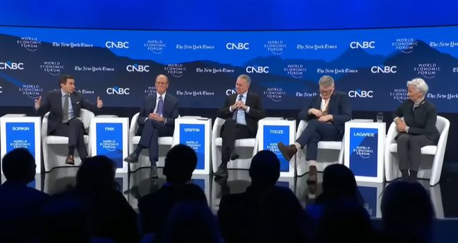 图:从左到右依次为达沃斯主持人安德鲁、贝莱德CEO拉里·芬克、城堡证券创始人肯·格里芬、著名经济历史学家亚当·图兹、欧洲央行行长拉加德