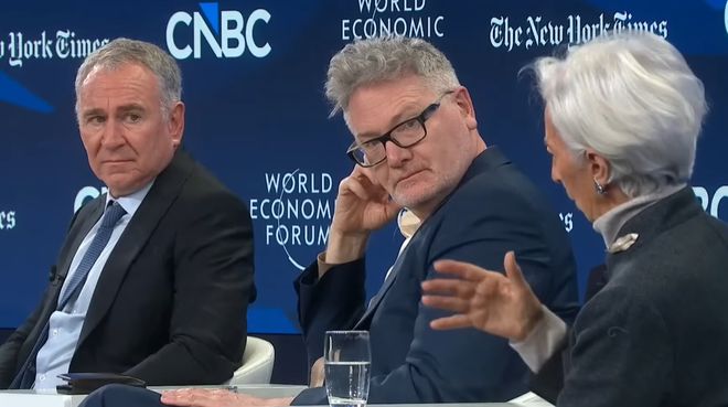 在2026年世界经济论坛次日的重磅小组讨论中,全球最大的资产管理公司贝莱德CEO、“华尔街教父”拉里·芬克(Larry Fink,管理14万亿美元资产)、最成功的对冲基金之一城堡证券创始人肯·格里芬(Ken Griffin,管理650亿美元资产)、欧洲央行行长克里斯蒂娜·拉加德(Christine Lagarde)以及著名经济历史学家亚当·图兹(Adam Tooze)齐聚一堂。