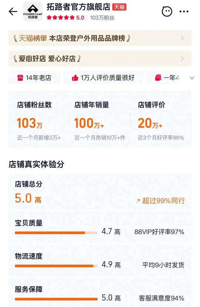 拓路者店铺5分真实体验分 图源:拓路者官方旗舰店