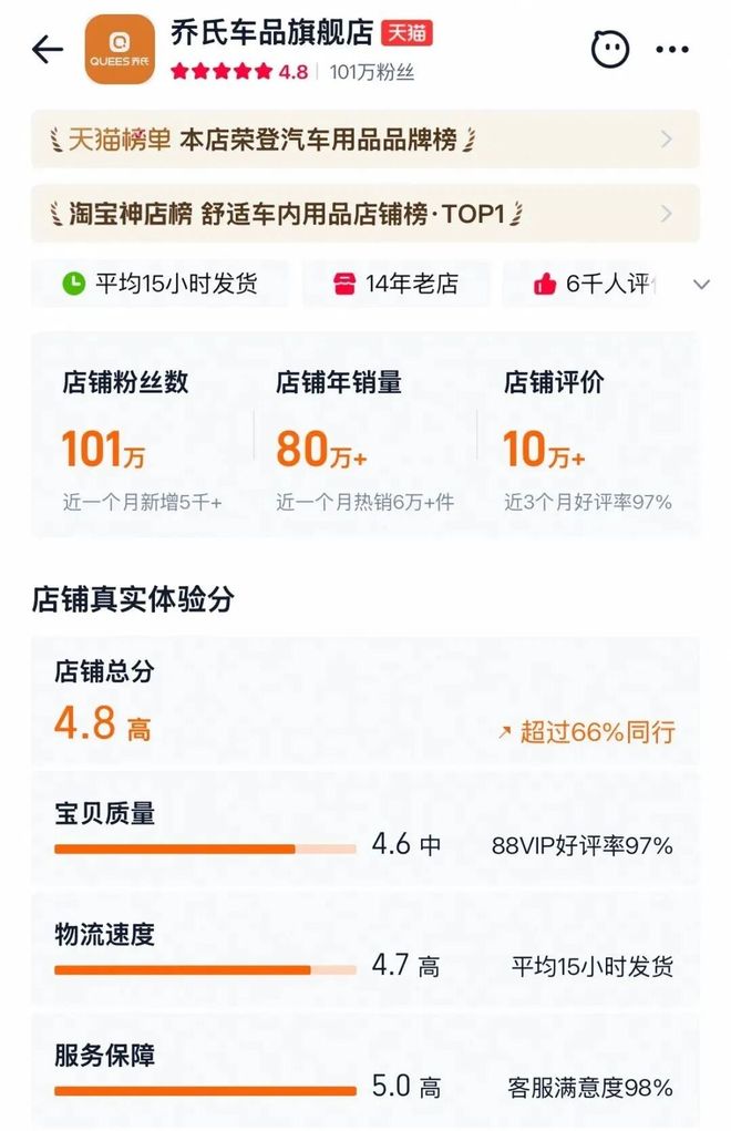 乔氏店铺4.8的真实体验分 图源:乔氏车品官方旗舰店截图